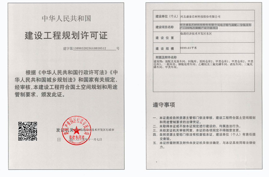 河北盛泰芯材科技股份有限公司电子特气混配、分装及年产1500吨次磷酸产业升级项目