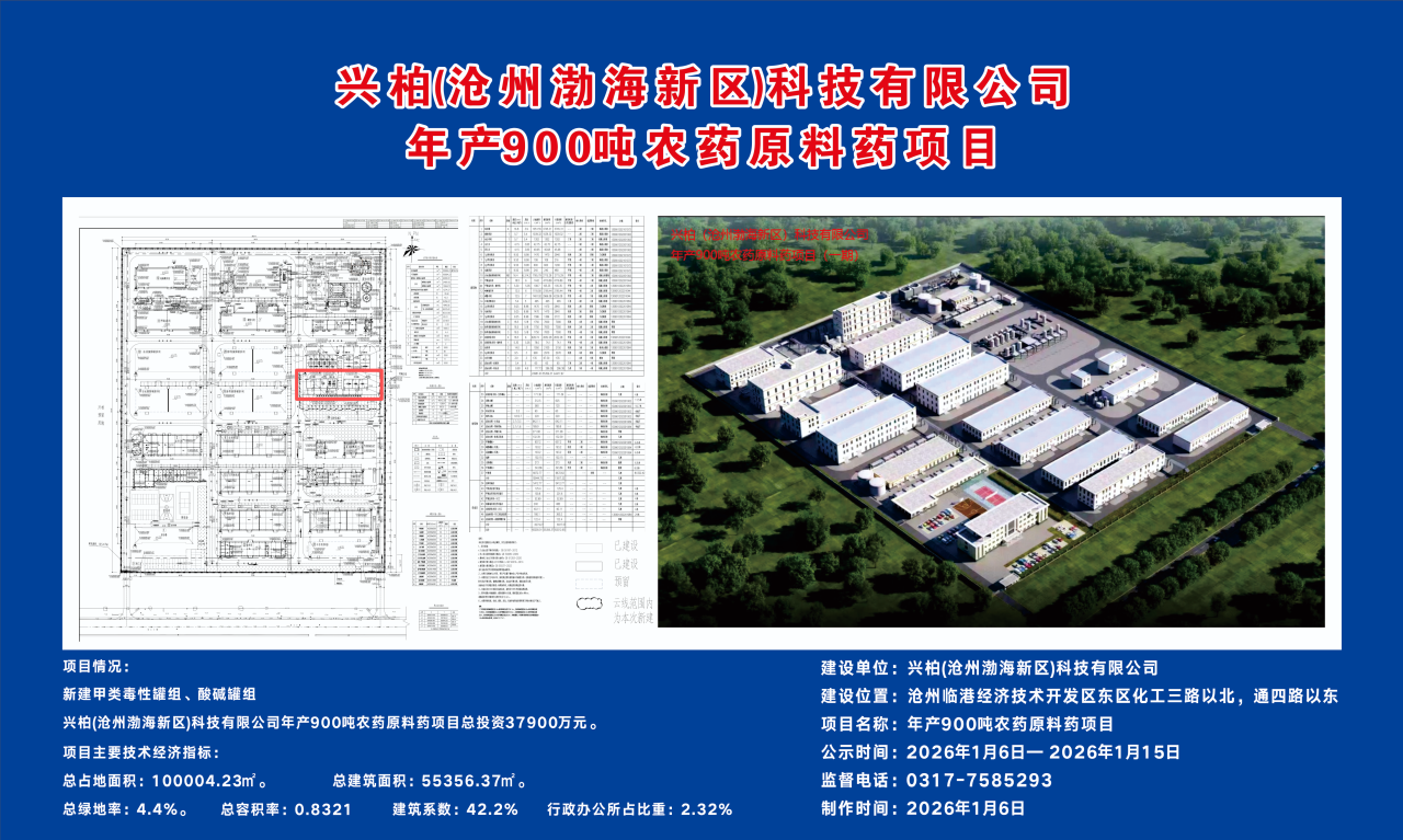 兴柏(沧州渤海新区)科技有限公司年产900吨农药原料药项目总投资37900万元。