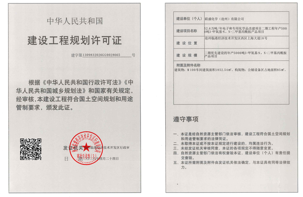 联盛化学(沧州)有限公司52 .6 万吨/年电子和专用化学品改建项目二期工程年产50 00 吨3-甲氧基-N ,N-二甲基丙酰胺产品项目